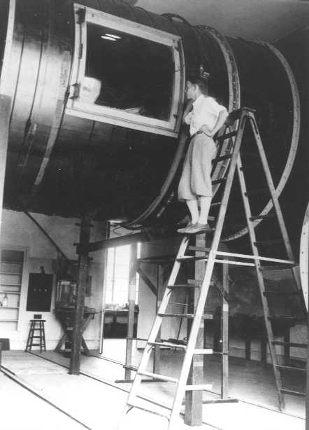 1933: Prof. Clark Milligan plus assistent at work inside Galcit tunnel on Douglas DC-3model