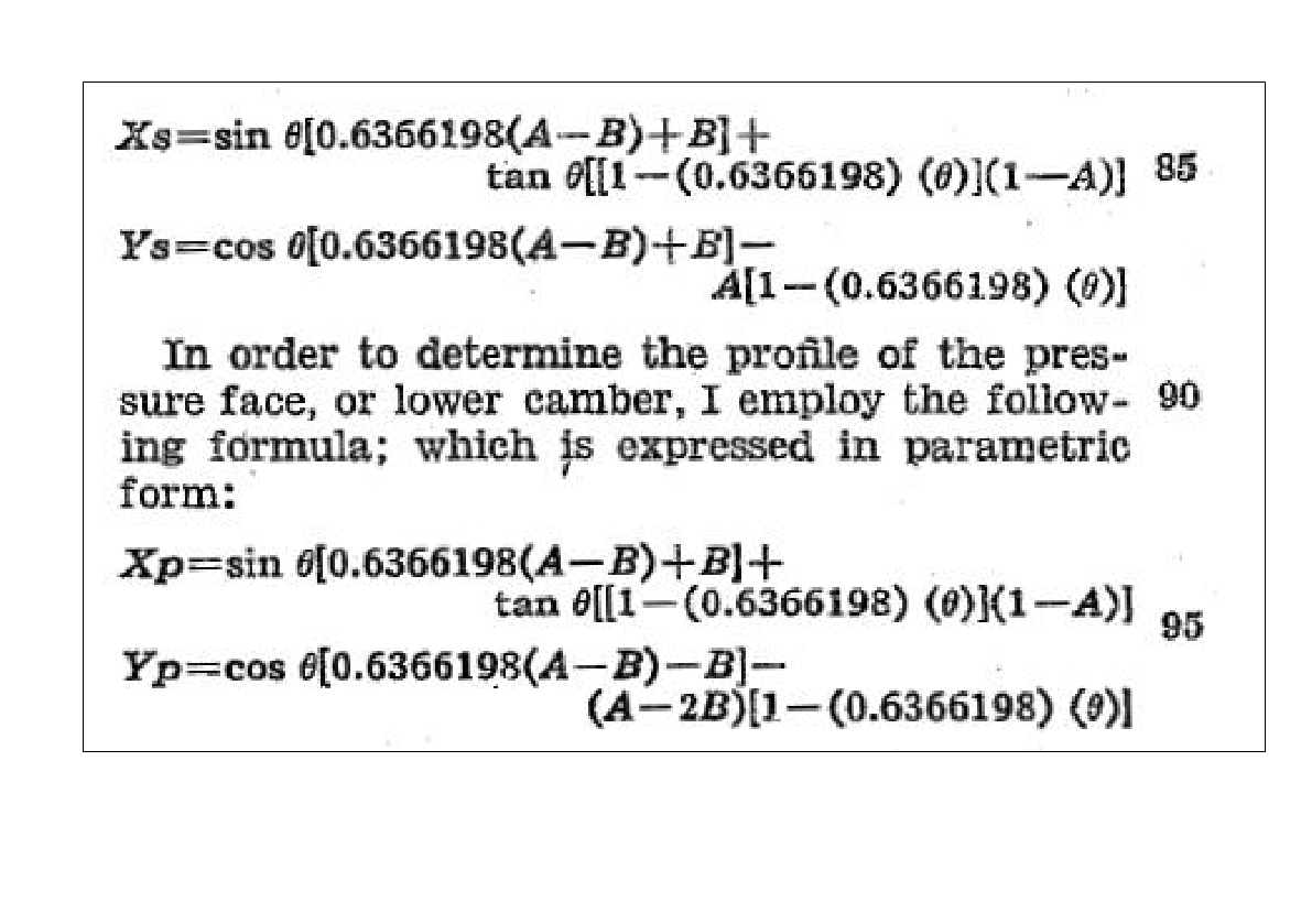 The Consolidated executives received their guests politely and, after the introduction, proceeded to look somewhat bewildered at the presented patent. It showed numerous unwieldy pairs of formulas apparently describing the form of the upper surface of a wing section (suction side) and of the under surface of the same wing section (pressure side). It should be noted that the formulas contained multiple appearances of two parameters, A and B, whose actual values were left unspecified. Written in this way, the paired formulas did not describe a single wing section, but a whole family of sections.