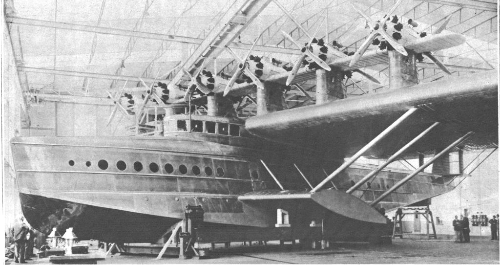 There is a crew of twenty needed to control the airplane and serve the passengers. The creator of this enormous colossus, Ir. Dornier, has stated that three or four of the engines may be stopped during flight without problems. However, the crossing of the ocean is not yet possible with this giant – it is not more than a step forward on the difficult road to trans-oceanic air traffic. On the photograph the immense monoplane is shown in the assembly hall of the Dornier factory.